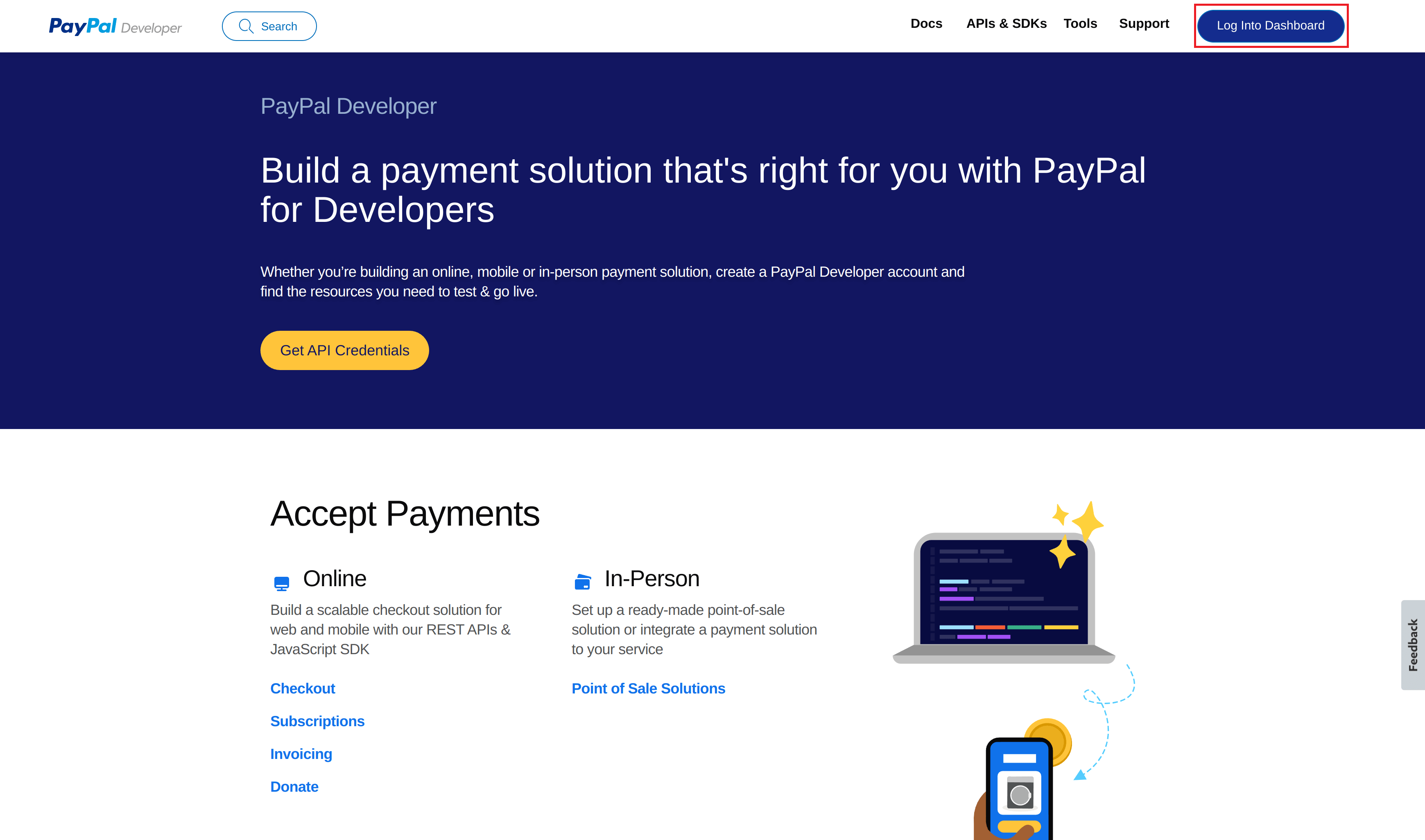 Firstly, login to PayPal by clicking the blue 'Log into Dashboard' button at the top right of the page.